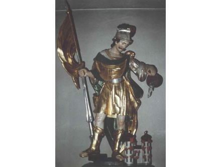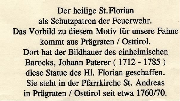 Der Fahnenausschuß entwickelte über mehrere Monate einen Entwurf, der zusammen mit der Fahnenfabrik Karlsruhe in eine Handskizze umgesetzt wurde. Dabei wurde auf das Modell des Heiligen St. Florian, Schutzpatron der Feuerwehr, zurückgegriffen, der im imginal in der Pfarrkirche in Prägarten (Österreich) steht. "Entdeckt" wurde dieser Heilige St. Florian von einer unserer Feuerwehrgruppen bei einer Kameradschaftsfahrt. Geschaffen wurde der Heilige St. Florian im 18. Jahrhundert von einem bedeutenden Osttiroler Bildhauer des Barrocks.