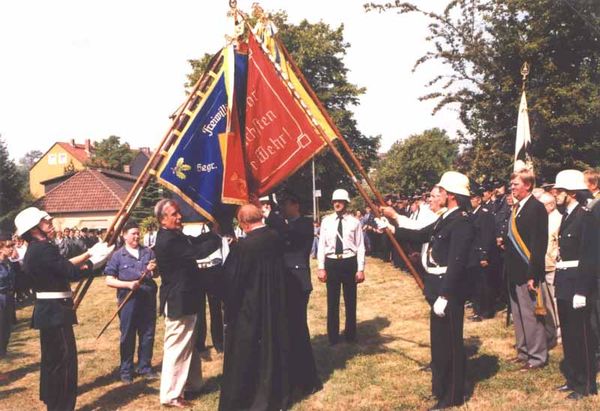 Am 18. Juni 1989 war es dann so weit. Die Wehr beging mit ihren Gästen die feierliche Fahnenweihe. Pastor Berger hielt einen feierlichen Gottesdienst und führte im Anschluss am Kirchturm bei herrlichem Wetter die Fahnenweihe durch. Die befreundeten Wehren, aus dem jetzigen und dem alten Löschbezirk sowie die Fahnen der örtlichen Vereine standen traditionsgemäß der neuen Rautheimer Feuerwehrfahne als Pate zur Seite.